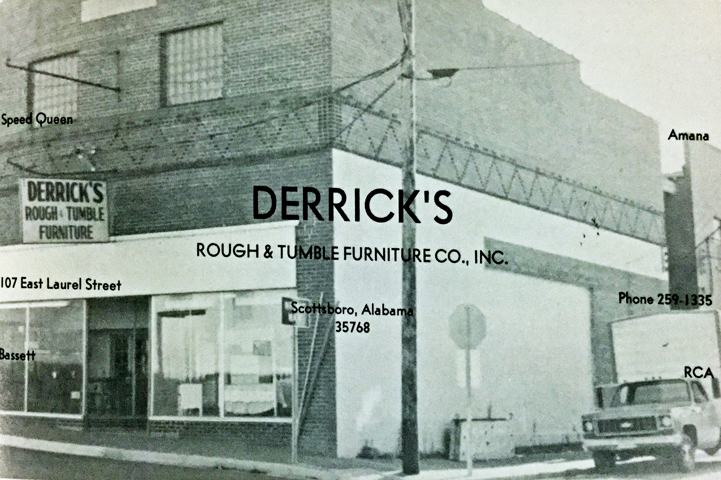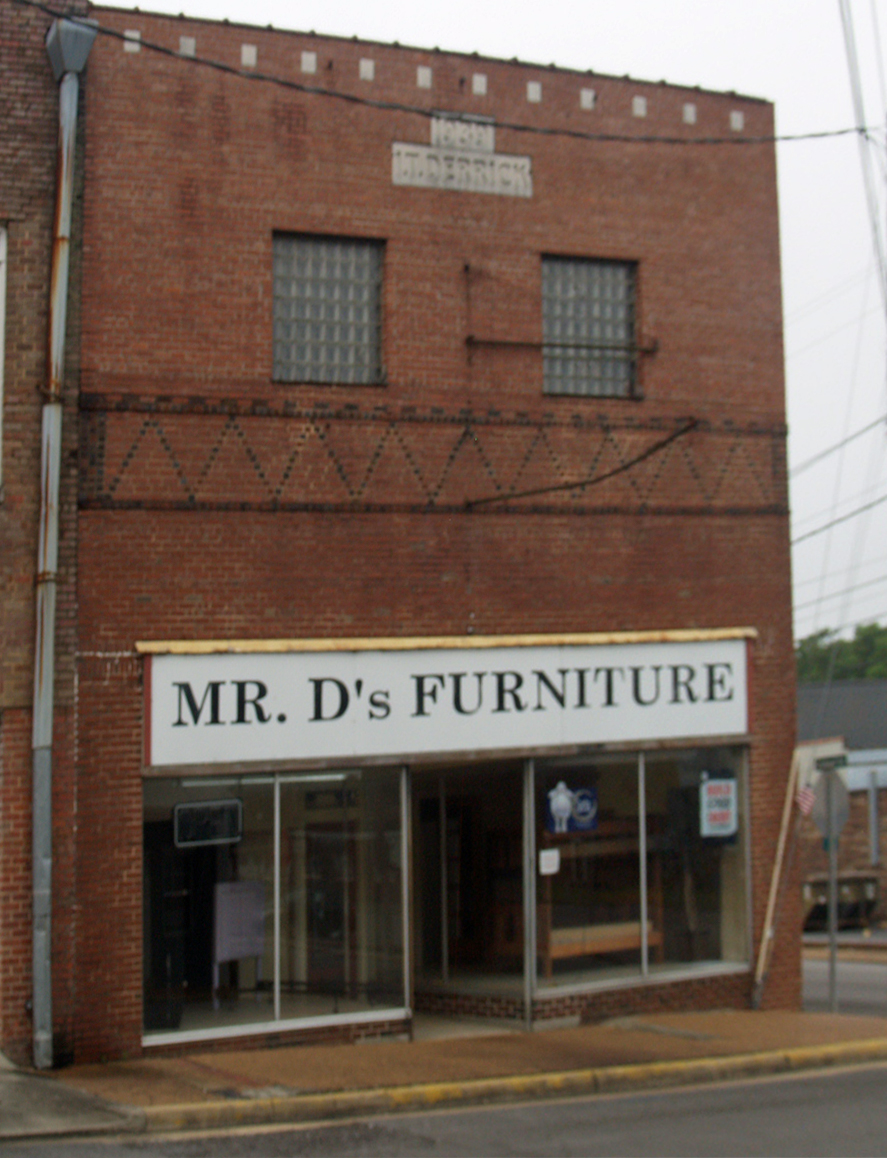 Built in 1939 on the site of the original Snodgrass Theater and the Scottsboro Opera House, the Waco Derrick Building is located at 107 West Laurel Street. It is a two-story brick building with two single windows on the second floor. The ground floor has been heavily altered to accommodate display windows. A plate reading “1939 I. T. Derrick” is near the top of the second story. It was the home of Rough and Tumble Furniture in the 1940s though at least 1979 and most recently of Mr. D’s Furniture. it is currently unoccupied.