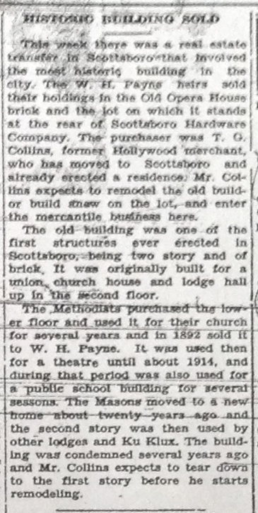 The first theatre in Scottsboro was located on this site. This building's ground floor was originally the home of the Baptist and Methodist churches, with the Masons owning the second story. When the Baptists and Methodists built their separate buildings in the 1880s, the ground floor became Scottsboro's first theatre. This building was the original home of the First Baptist Church, according to the church’s centennial booklet, in which this picture was published, with 1868-1877, showing the building as a church.
